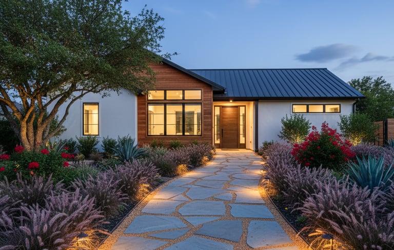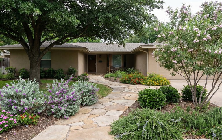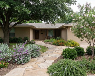 Evergreens: Dwarf Yaupon Holly, Indian Hawthorn, Texas Sage (Cenizo) provide year-round greenery and structure.